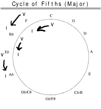 All those chords/notes are right next to each other in the circle. Knowing that, you can now get the chord note names for any key. For example, if you need to practice in the key of Ab, mark Ab as I. The V chord happens right before it counterclockwise, so the V chord is Eb. Before the Eb V chord is the ii chord, which would be Bb, etc. etc. There are many ways to practice these and at first it’s probably a good idea to just stay in one key for a while until the movement is familiar. Play through the progression several times until your fingers and ears begin to recognize the pitches and then move on to another.